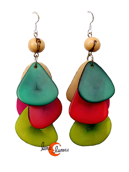 Pendiente hecho con semillas de tagua. Son pendientes artesanales, muy vistosos, originales y divertidos, las semillas mantienen siempre el color y el brillo. No pesan, son muy livianos.