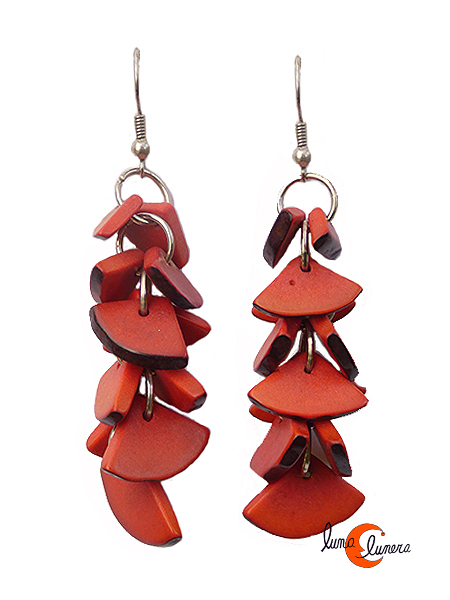 Pendiente hecho con semillas de tagua. Son pendientes artesanales, muy vistosos, originales y divertidos, las semillas mantienen siempre el color y el brillo. No pesan, son muy livianos.