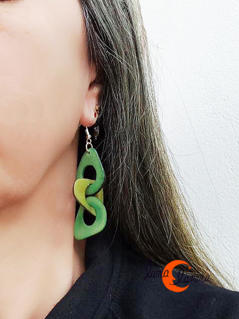 Pendiente grande hecho con semillas de tagua con tres piezas entrelazadas como cadena. Son pendientes artesanales, muy vistosos, originales y divertidos, las semillas mantienen siempre el color y el brillo. No pesan, son muy livianos. Bisuteria orgánica. Cada uno es diferente, no existen dos pendientes iguales, incluso, aunque sean pareja.