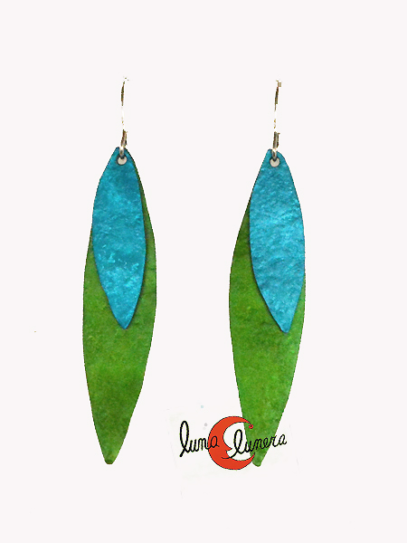 Colección Oana Millet, joyas de aluminio. Pendiente grande doble hoja de olivo, verde y turquesa.