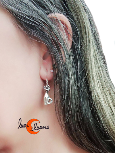 Pendientes de plata de 925 de pureza de tamaño pequeño. Pendiente de plata lisa con cierre abierto con forma de gatos. No pesa.