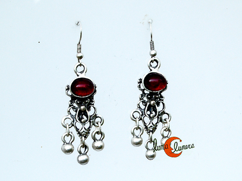 Turquía tiene una preciosa tradición joyera. Estos pendientes, de fabricación artesanal, están hechos en Zamak (material que no se pone "feo") inspirados en la joyería antigua de ese país. Pendiente con cristal ovalado color granate con tres bolitas colgando. Tamaño 1,8 por 4,2 cm. (sin gancho).