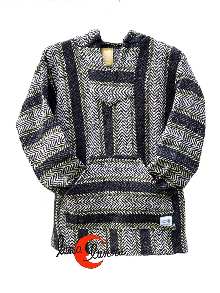 Ponchos para chica o chico con capucha y bolsillo frontal tipo canguro. Hechos en México con fibras recicladas cuyo proceso consiste en recolectar textiles destinados a ser desperdicio; limpiarlos y separarlos por tonos y colores; desintegrarlos para formar micro fibras y fabricar hilo; hilos que finalmente son tejidos en telares tradicionales para producir cada una de las prendas en pequeños talleres artesanales.