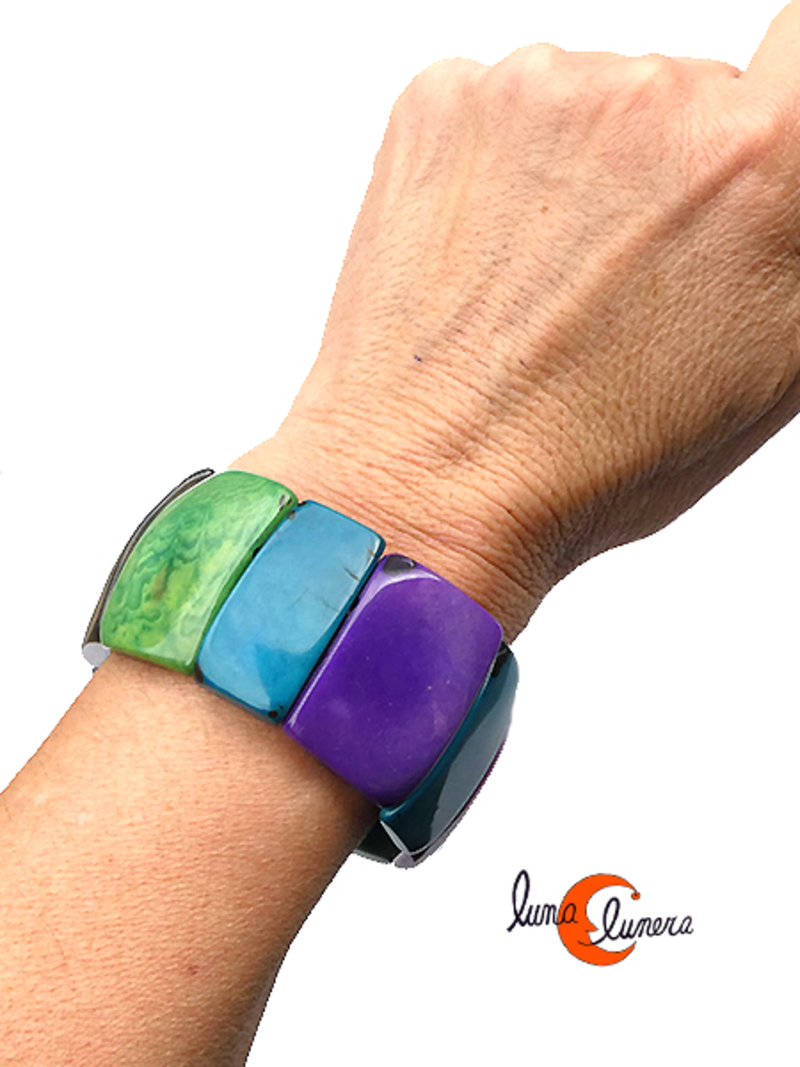 Pulsera de semillas de tagua, rectángulos morados, verdes y azules.