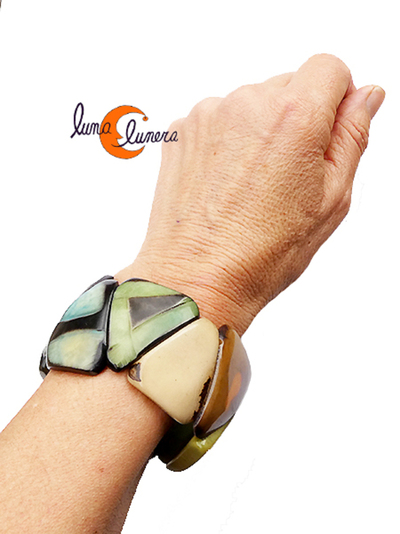 Pulsera hecha con piezas triangulares de semillas de tagua de colores. Está hecha con silicona elástica.