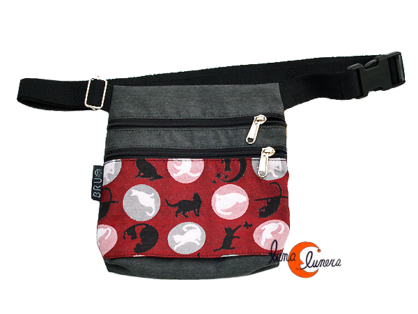 Riñoneras de tela BRUO. Riñonera mediana con dos cremalleras gatos granate.