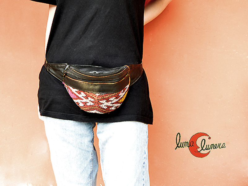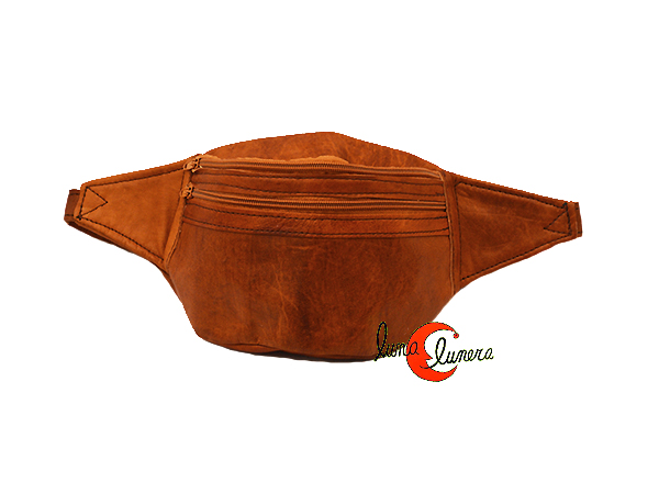 Riñoneras de piel de Marruecos color natural. Tiene dos cremalleras, una del compartimento principal y la otra de un bolsillodelantero. Cintura regulable, lo que permite llevarla tanto a la cintura, como cruzada.