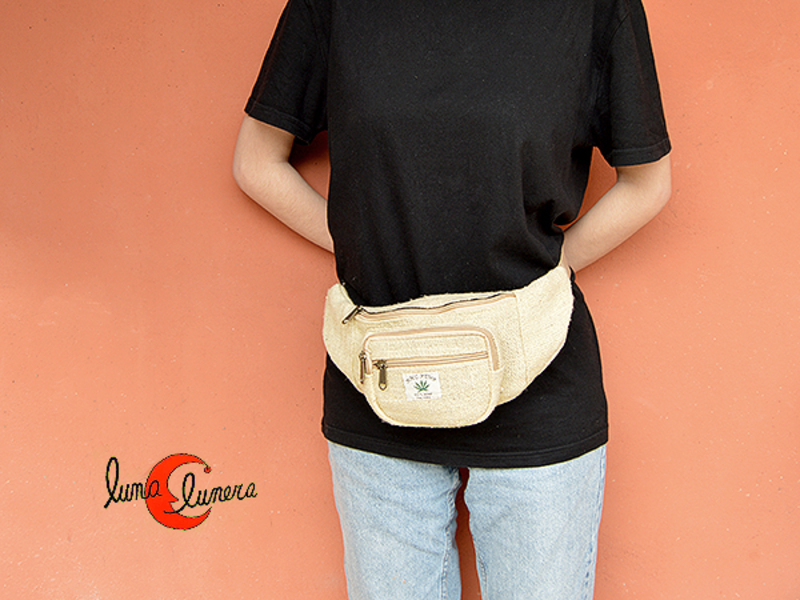 Riñoneras de tela cáñamo orgánico libre de THC. Forradas por dentro. Tienen cuatro cremalleras, una del compartimento central, dos de un pequeño bolsillo delantero y la cuarta antirrobo por la parte trasera. Cintura regulable, lo que permite llevarla tanto a la cintura, como cruzada.