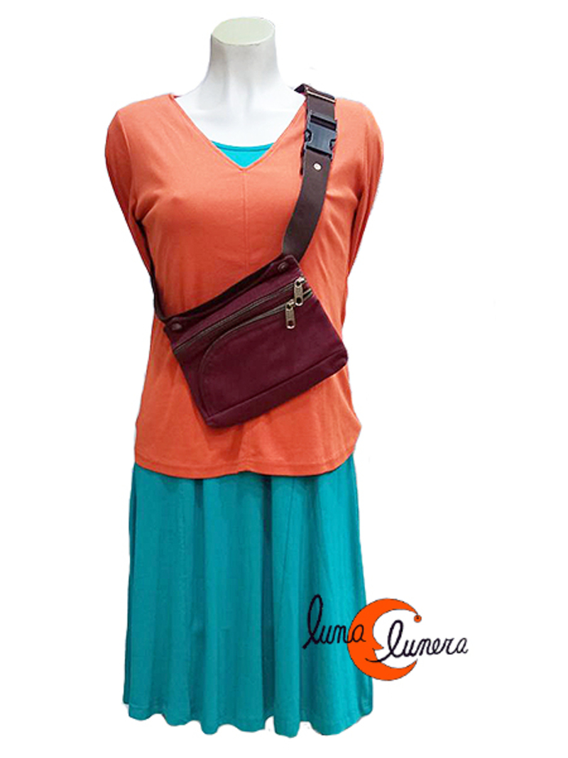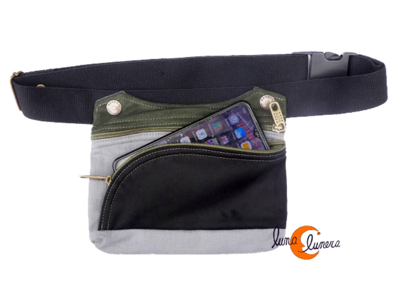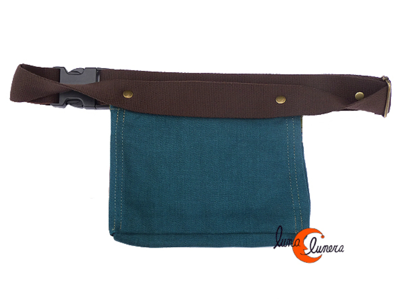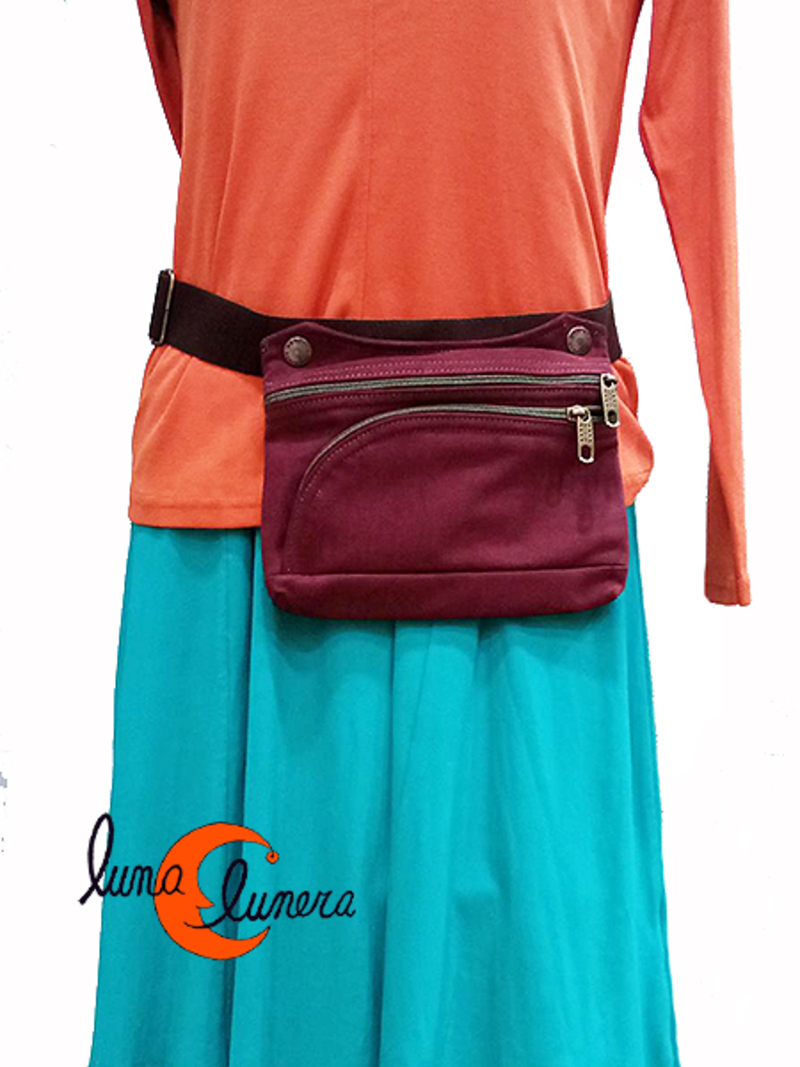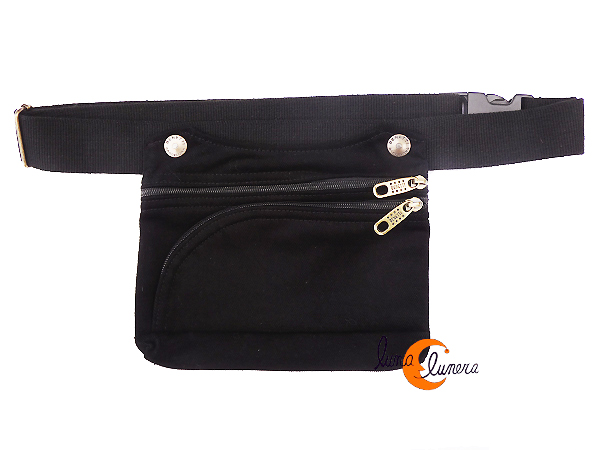 Riñonera unisex, para chico o chica, muy práctica, con tres espacios: uno por detrás sin cremallera pero que se protege con el propio cinturón; los otros dos compartimentos cierran con cremallera: el principal con bastante capacidad para llevar monederos, llaves y documentación y por último, un bolsillo por delante con cremallera redondeada donde cabe un teléfono móvil de medida estandar (8 por 16 cm. máximo). Es un diseño perfecto para llevar muchas cosas y bien ordenadas: cada cosa en su sitio y siempre a mano. Asa de algodón regulable. Lavable en la lavadora.