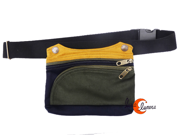 Riñonera unisex, para chico o chica, muy práctica, con tres espacios: uno por detrás sin cremallera pero que se protege con el propio cinturón; los otros dos compartimentos cierran con cremallera: el principal con bastante capacidad para llevar monederos, llaves y documentación y por último, un bolsillo por delante con cremallera redondeada donde cabe un teléfono móvil de medida estandar (8 por 16 cm. máximo). Es un diseño perfecto para llevar muchas cosas y bien ordenadas: cada cosa en su sitio y siempre a mano. Asa de algodón regulable. Lavable en la lavadora.