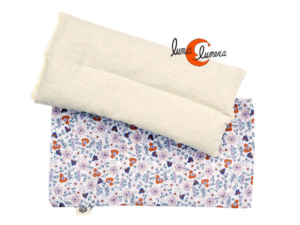 Saco térmico terapéutico de semillas, olor lavanda. Florecillas blanco.